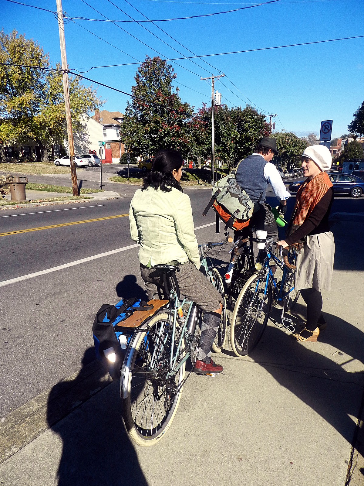It was a gorgeous morning. Meet up and registration was at Too Many Books, a locally owned bookstore in Roanoke. There everyone hung out and had coffee and tea to warm their bones (temperatures hovered in the 40s) and socialized with fellow riders. Below are pics of the tweeded-out participants. Come back in a few days to see shots of the actual ride.